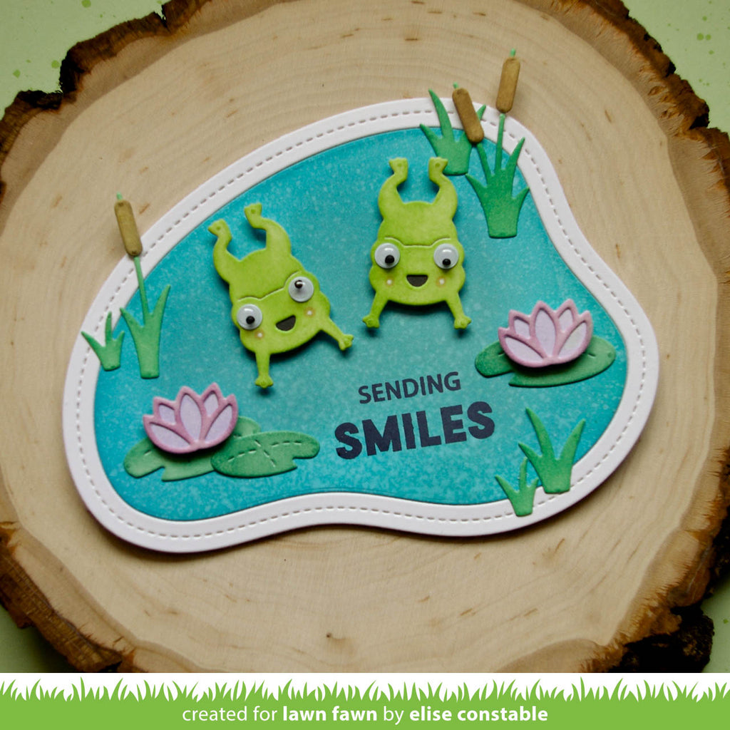Make a cute pond for swans, frogs, and other critters. Finish the scene with lily pads, cattails, and grassy details. This set pairs perfectly with Stitched Pond, making it great for creating shaker cards!