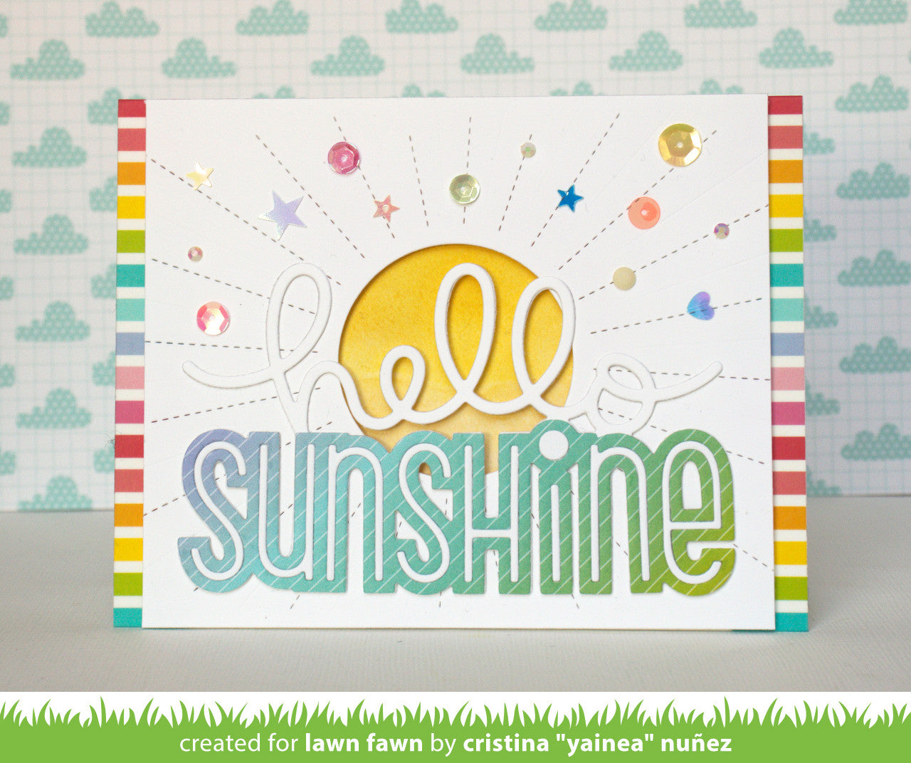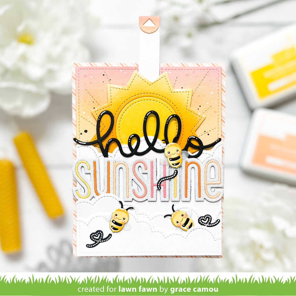 Send someone lots of sunshine-y greetings to brighten their day! This giant sentiment fits a standard sized card for quick cards with lots of pizazz!