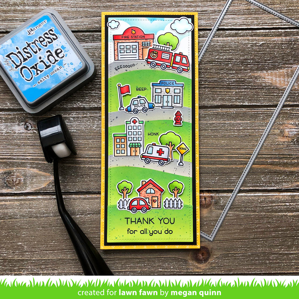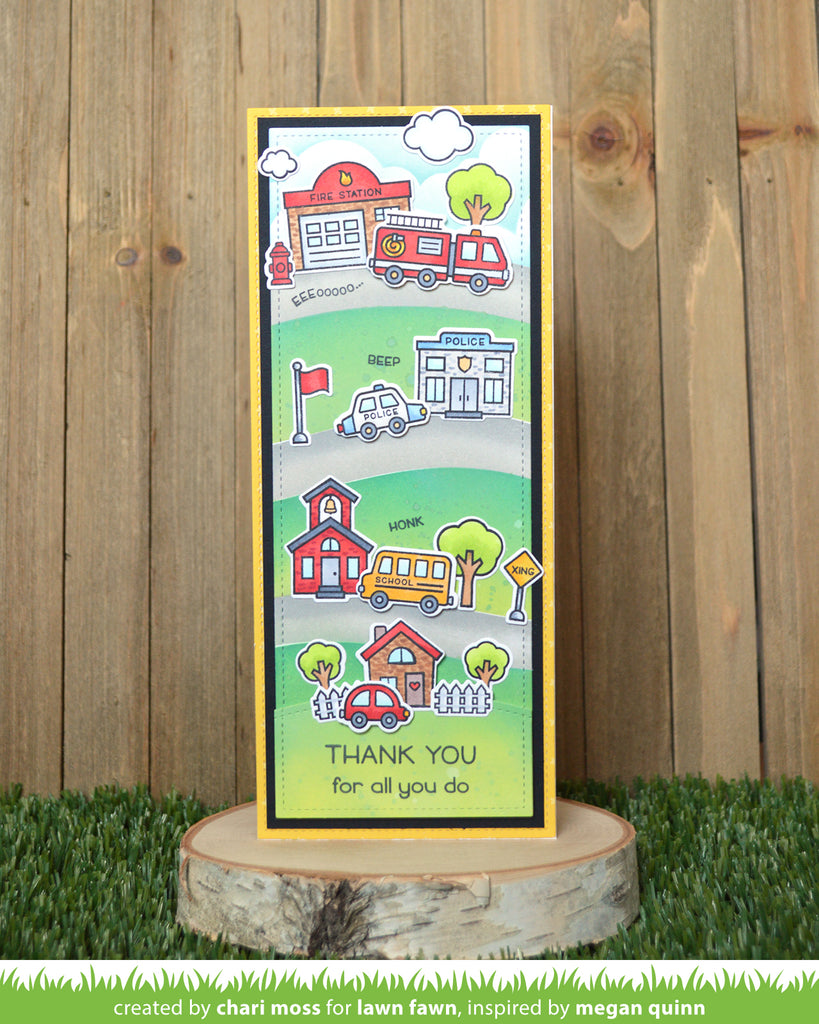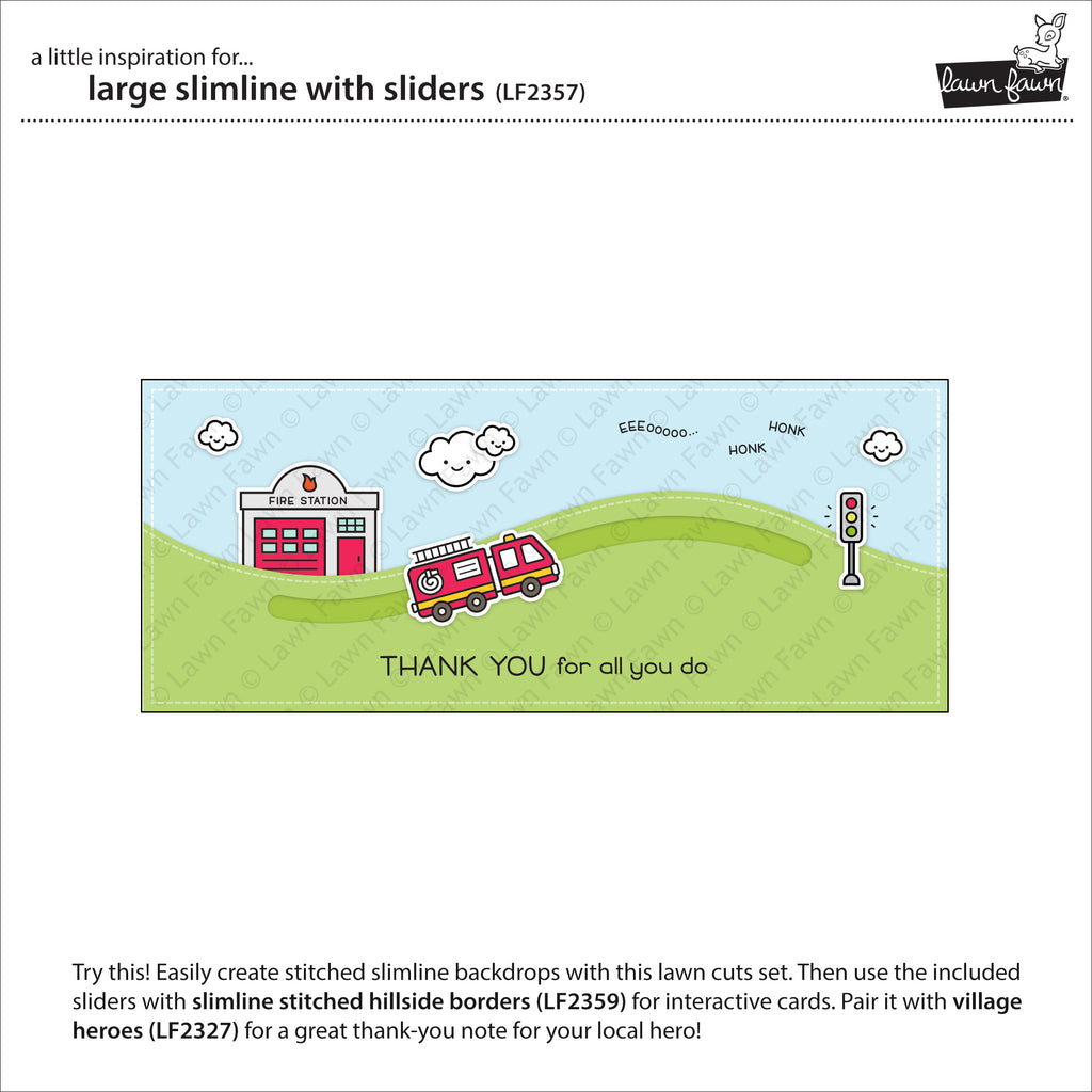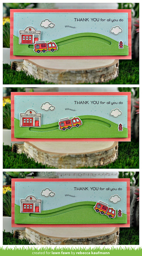 Coordinating set ideas: Pair this set with Slimline Stitched Hillside Borders and Village Heroes to make a fun interactive card featuring a firetruck driving over a hillside!