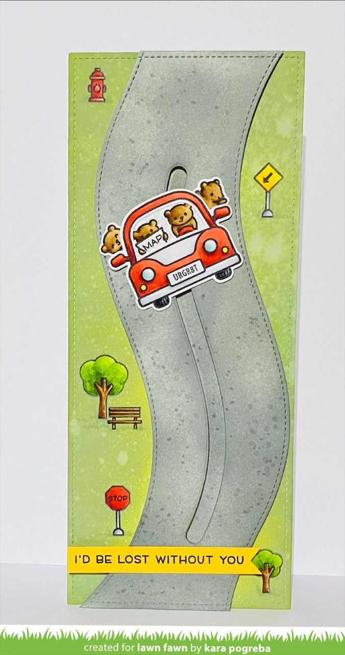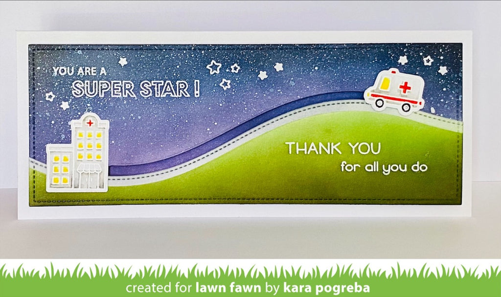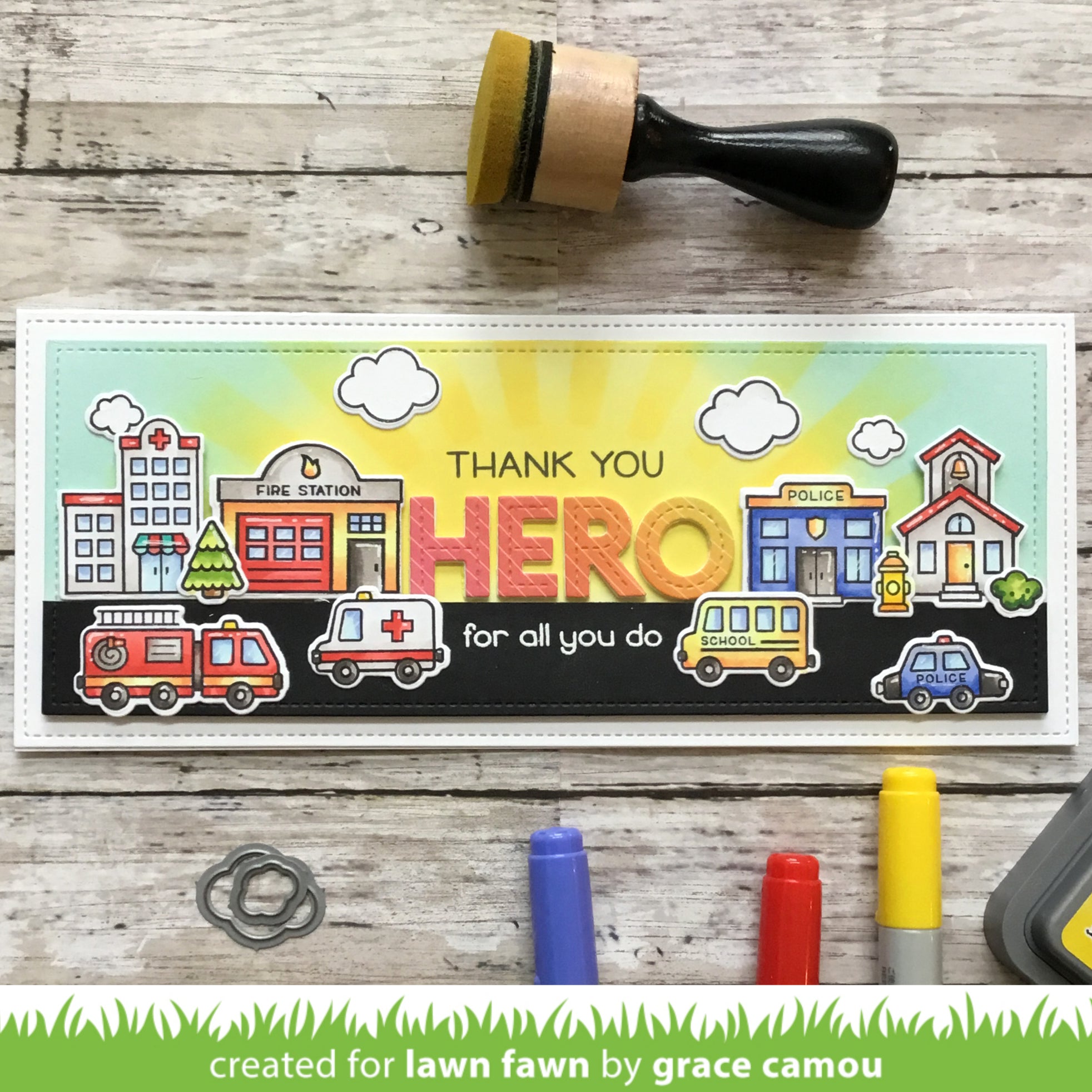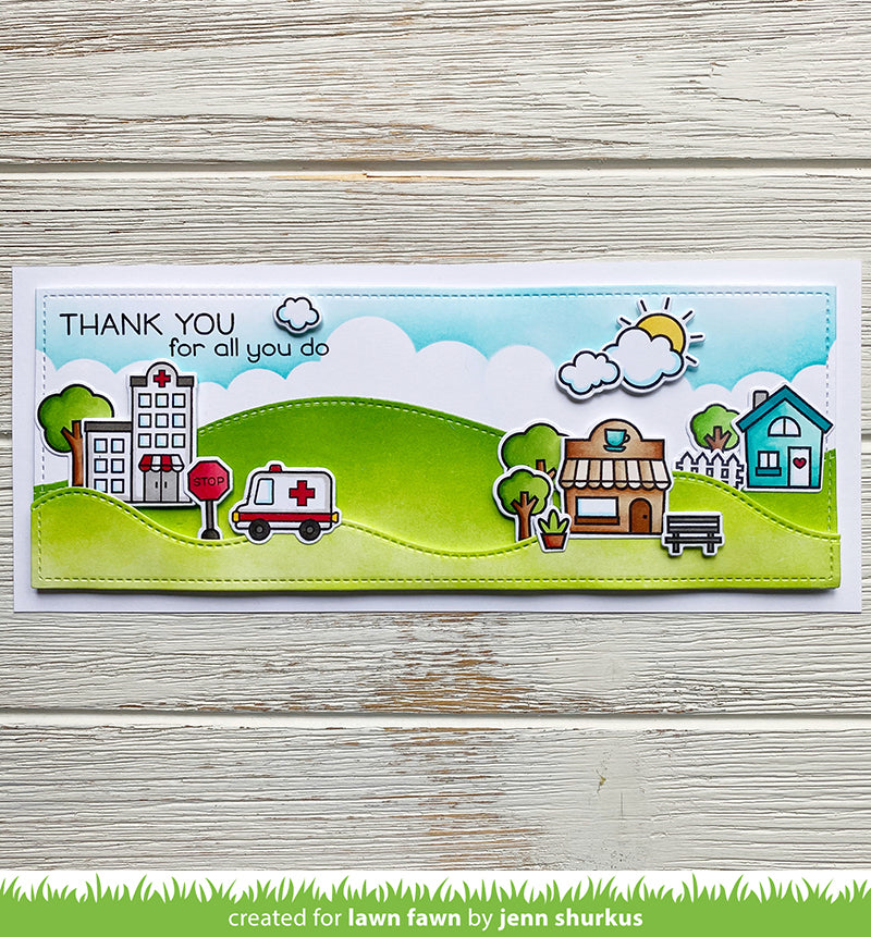 Coordinating set ideas: Pair this set with Slimline Stitched Hillside Borders and Village Heroes to make a fun interactive card featuring a firetruck driving over a hillside!