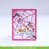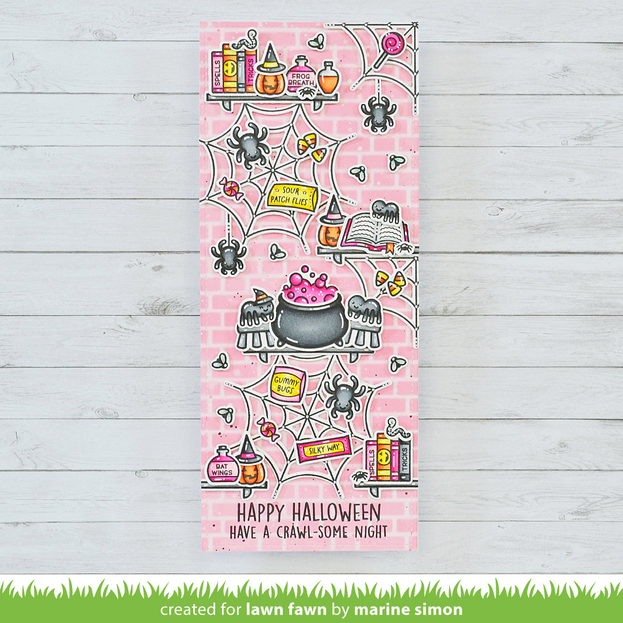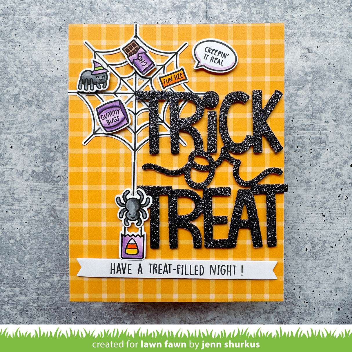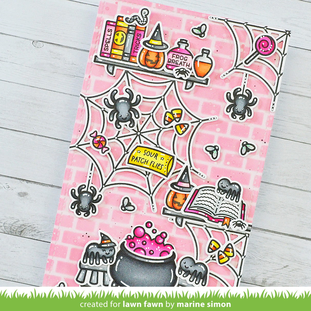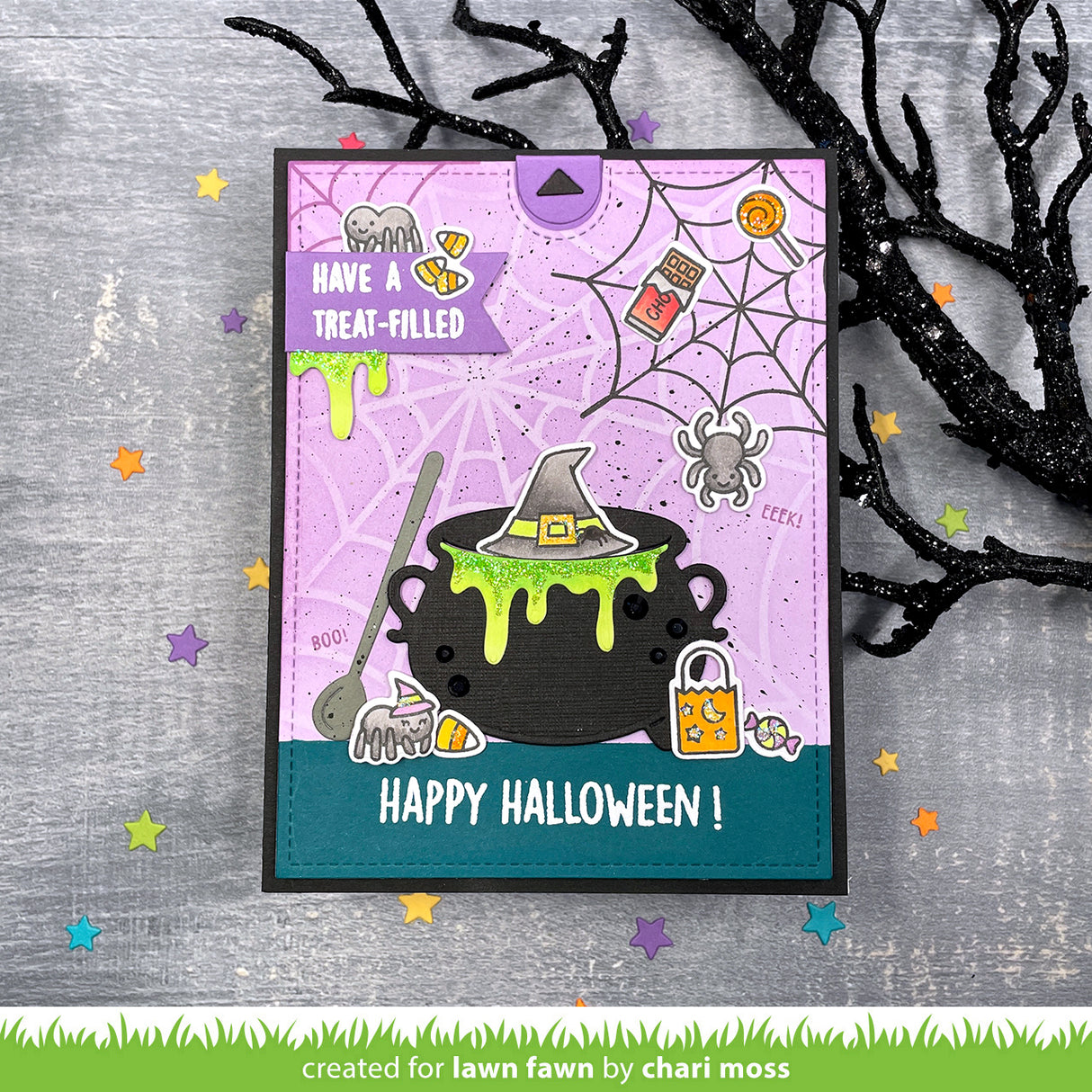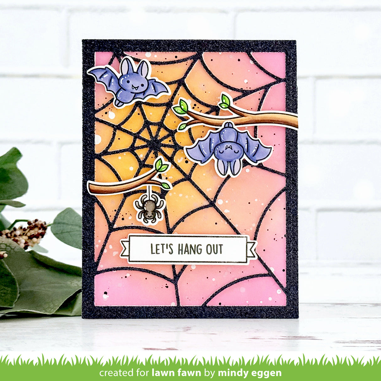 Coordinating set ideas: Turn this set into an amazing interactive project with Swivel Surprise or Give It a Whirl! The web fits perfectly and can be used to reveal the spiders candy stash! Spooky images from Purrfectly Wicked and Purrfectly Wicked Add-On would be an extra sweet addition too! The Spiderweb Backdrop is the perfect sticky web for spider friends too! Cut the backdrop from Black Sparkle Cardstock and add your spider friends for a quick and easy card. Do you love stenciling? Check out the Spiderweb Background Stencils to ink up your scene for more creating options.