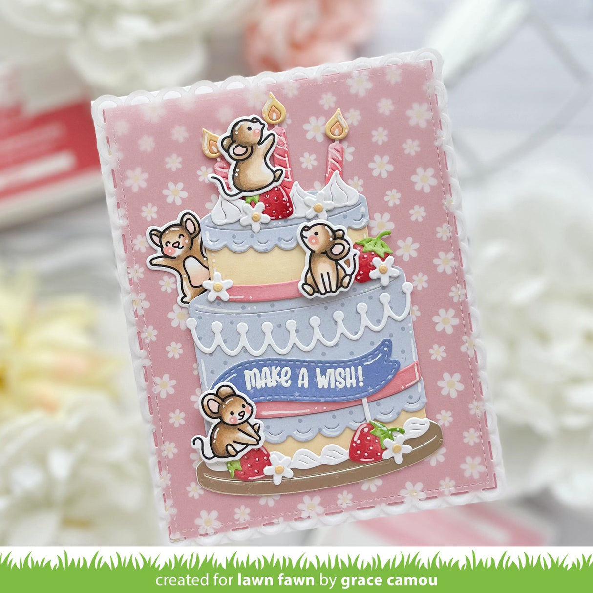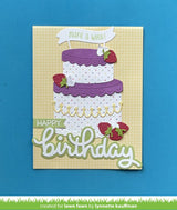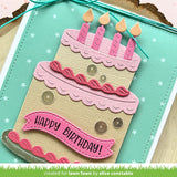 Coordinating set ideas: Have fun with shiny cardstock for the candles and flames! Top the cake with the whipped cream swirls and some yummy fruits found in the Build-A-Drink Collection of Lawn Cuts. This fun cake fits perfectly on the Pull ‘n Slide Surprise for a big and sweet surprise! Build a custom birthday greeting with Henry’s Build-A-Sentiment: Birthday!