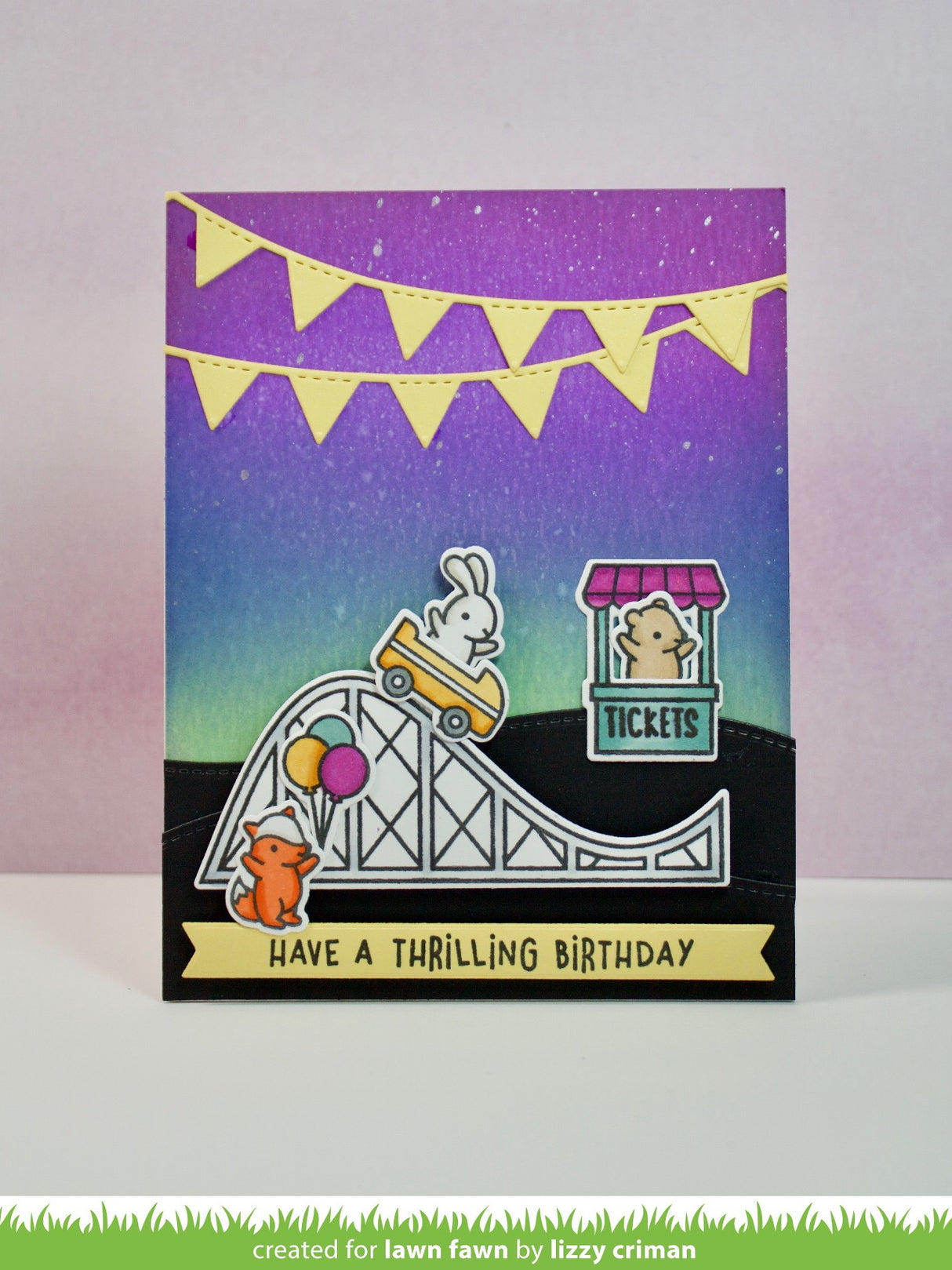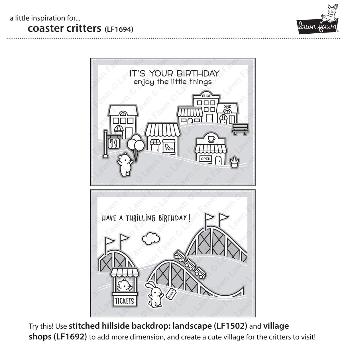 Coordinating set ideas: Use Coaster Critters Slide on Over Add-On to make a fun interactive card with a critter riding on a roller coaster. You can also decorate your card with Bunting Borders for a festive touch. For a non-coaster themed card, you can place the little animals inside a village from Village Shops, Happy Village, or Winter Village!
