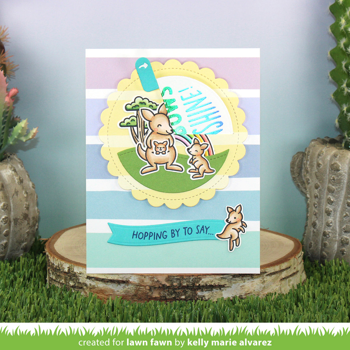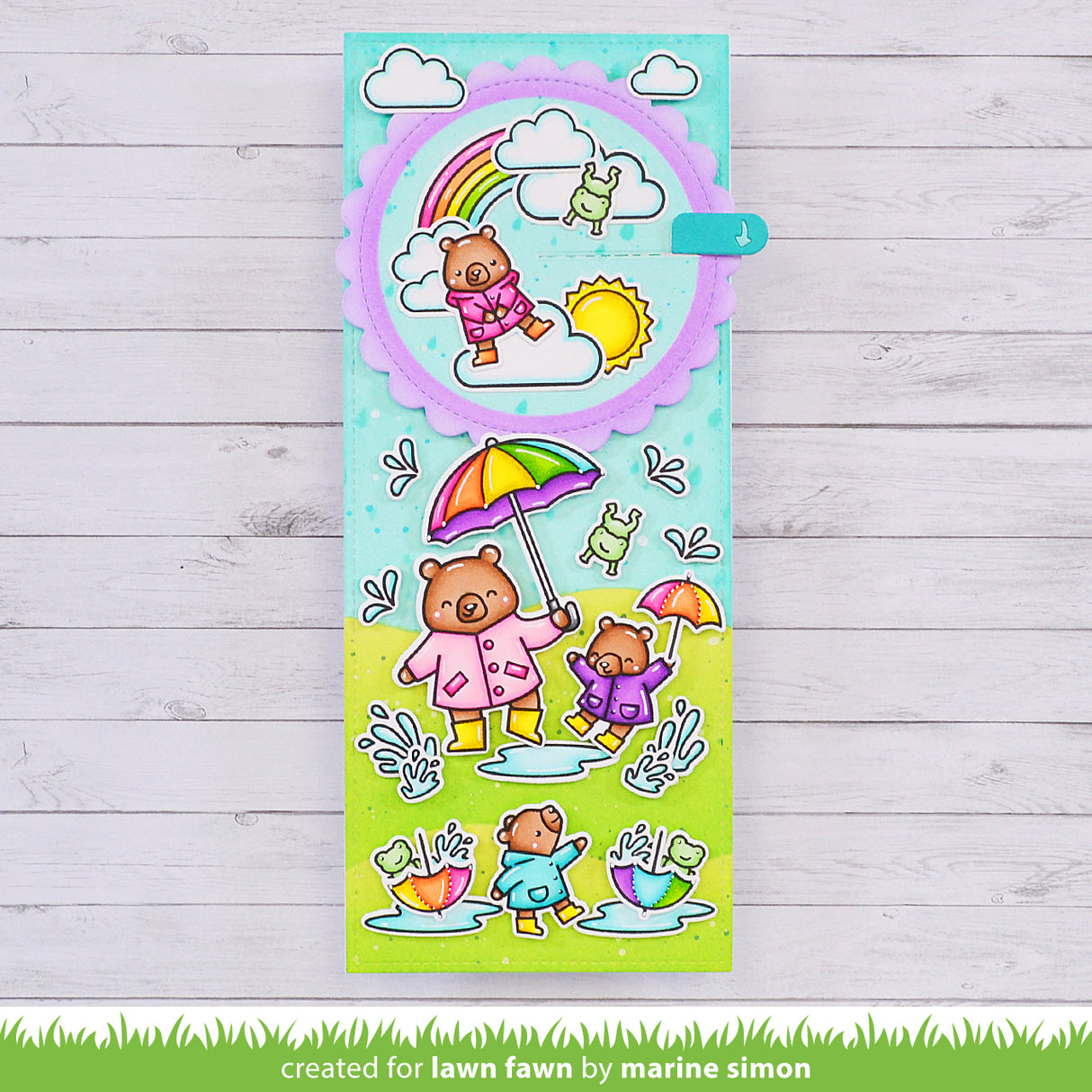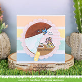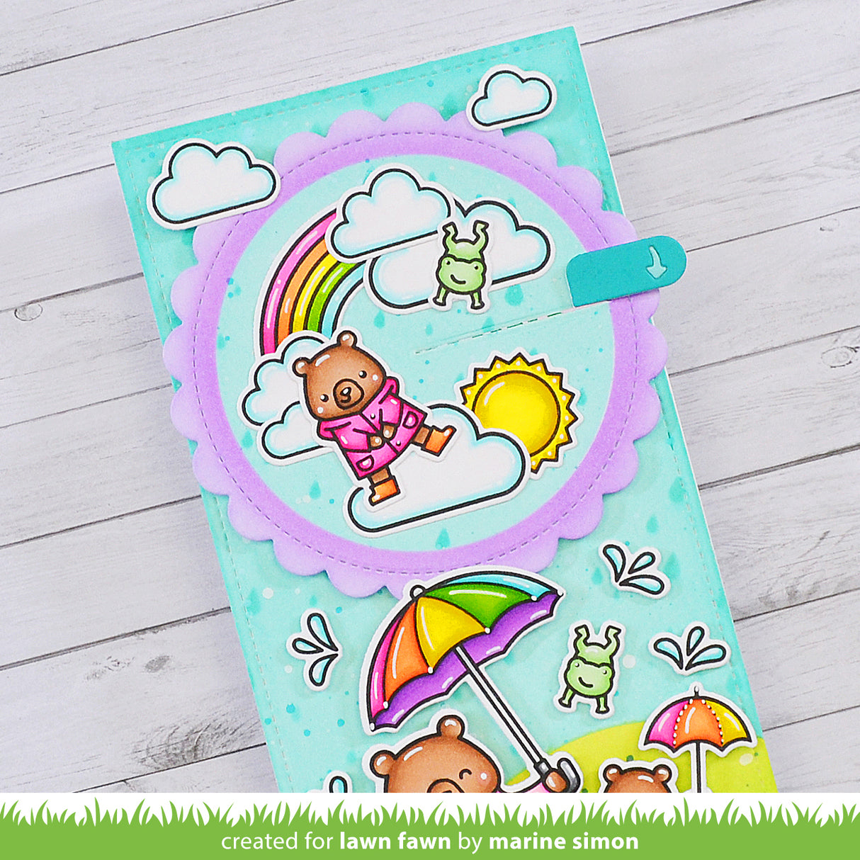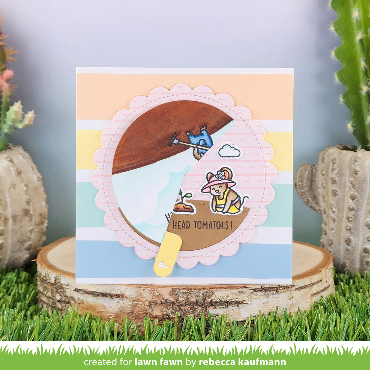 We are whirling with excitement over this new interactive set! Rotate the tab around the circle to reveal a new scene underneath! Combine it with your favorite critters or sentiments for infinite creative possibilities. Add a super fun scalloped base with Give It a Whirl Scalloped Add-On. Take the guesswork out of your design placement with the handy Give It a Whirl Template.