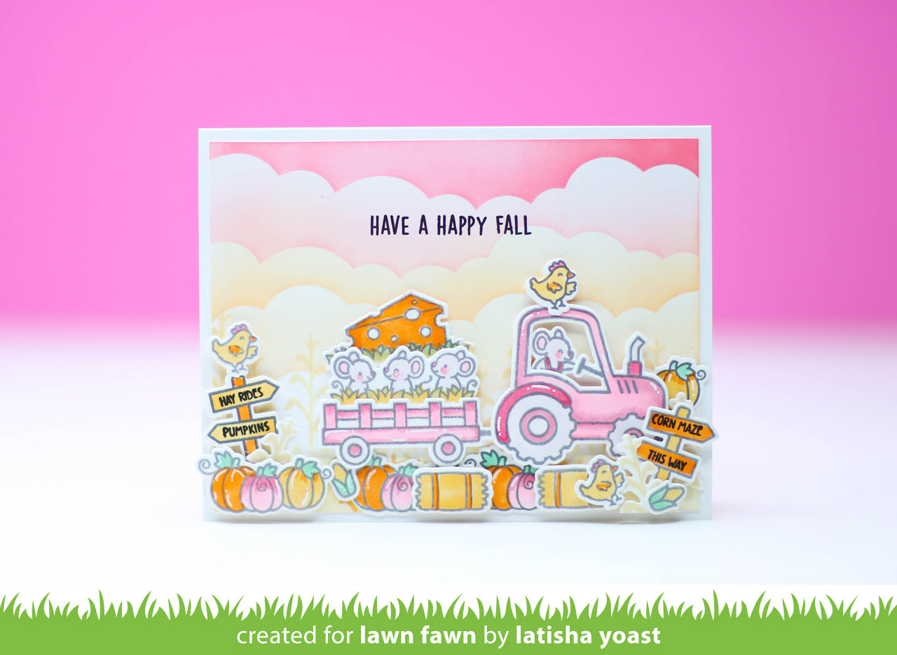 Coordinating set ideas: Build your harvest scene with lots of fall trees using Tree Before n’ Afters, Little Picket Fence Border, and Grassy Hillside Borders. Add more farm friends with Tiny Farm and Hay There too!