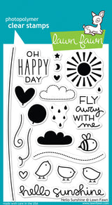 These 22 clear stamps are sure to brighten your day! This set contains cute birds, balloons, clouds, a sun, and other stamps to coordinate with the Hello Sunshine collection.