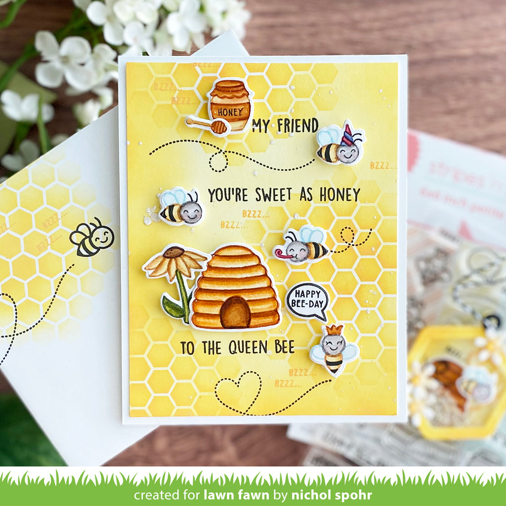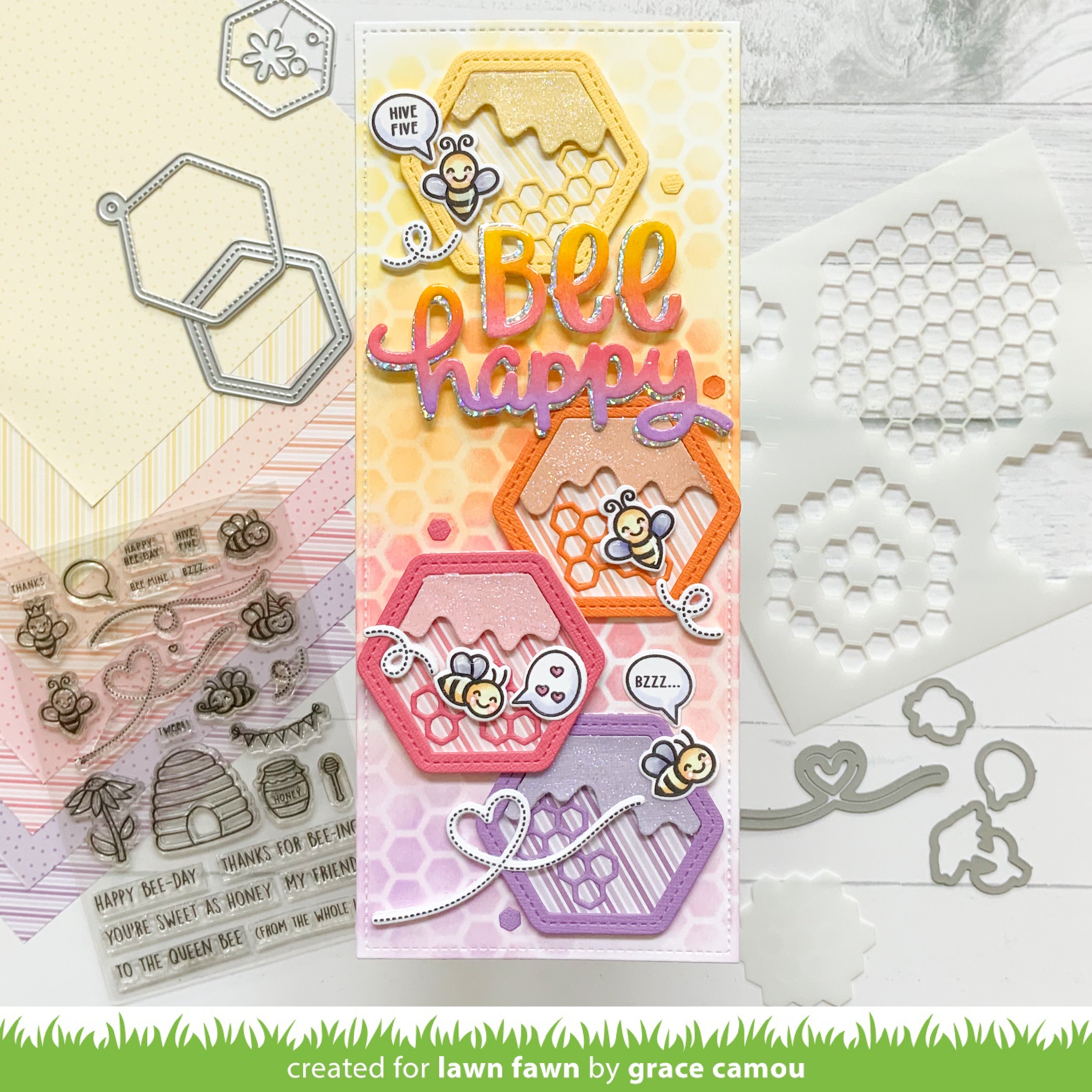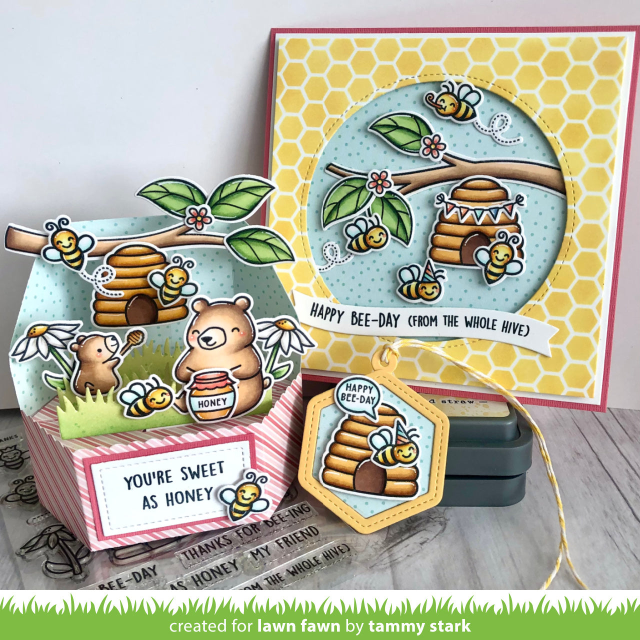 Coordinating set ideas: Create a sweet meadow scene with Meadow Backdrop: Landscape and Meadow Backdrop: Portrait. A Bug Deal has the perfect branch and leaves to hang your happy hive on. Add some really fun honeycomb pattern details with the Honeycomb Stencil! Add some sentiment trails to your buzzing bees with Just Plane Awesome Sentiment Trails. Do you know who else likes honey?! The sweet bears from Den Sweet Den!