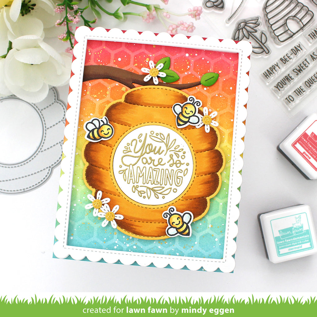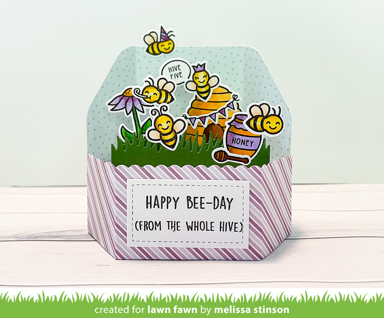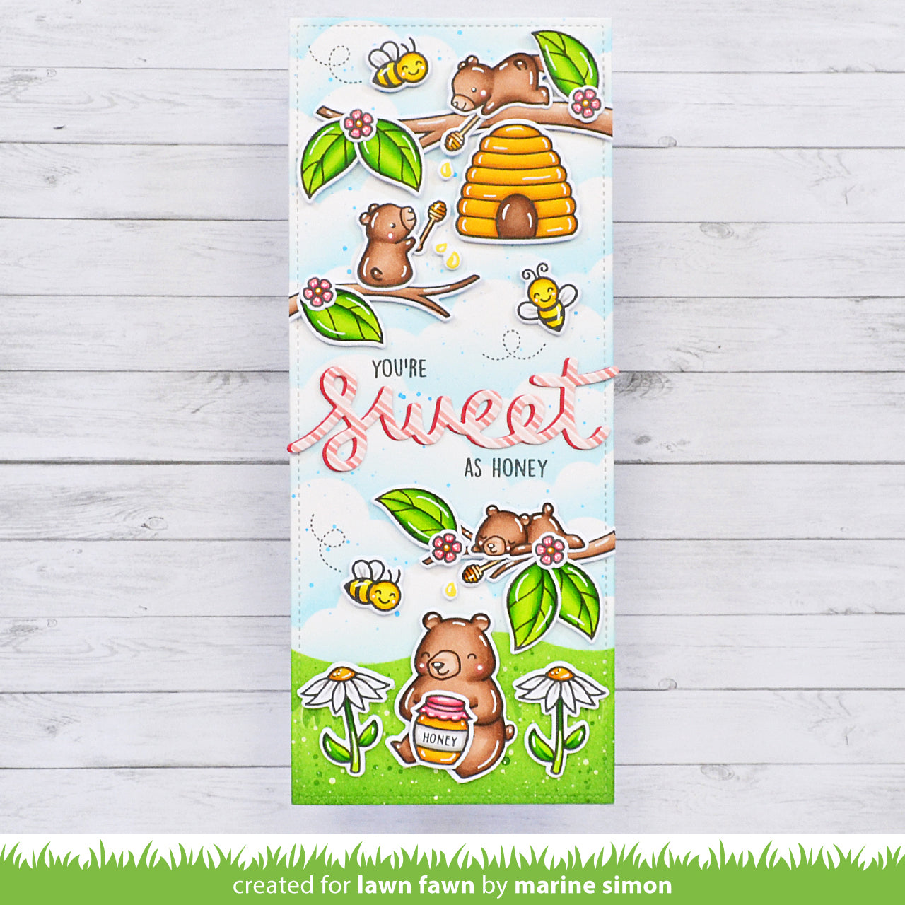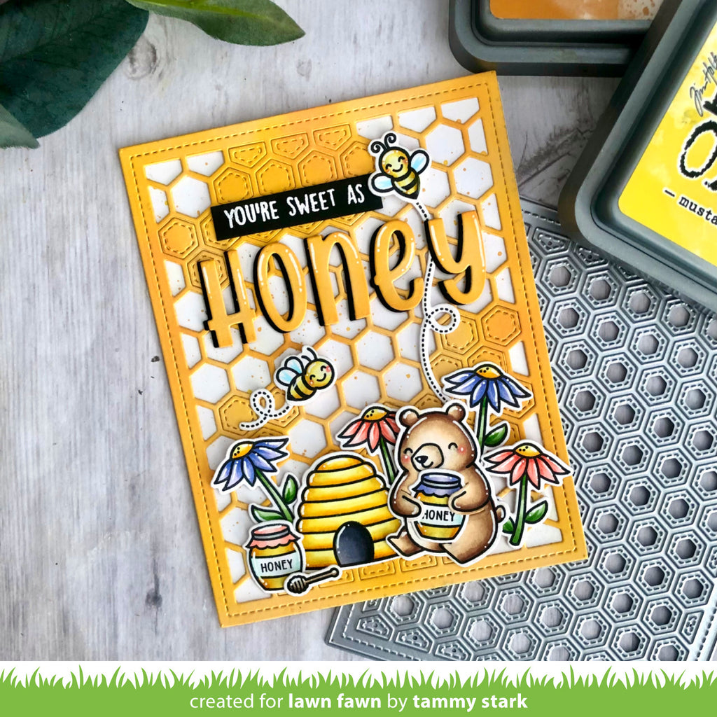 Coordinating set ideas: Create a sweet meadow scene with Meadow Backdrop: Landscape and Meadow Backdrop: Portrait. A Bug Deal has the perfect branch and leaves to hang your happy hive on. Add some really fun honeycomb pattern details with the Honeycomb Stencil! Add some sentiment trails to your buzzing bees with Just Plane Awesome Sentiment Trails. Do you know who else likes honey?! The sweet bears from Den Sweet Den!