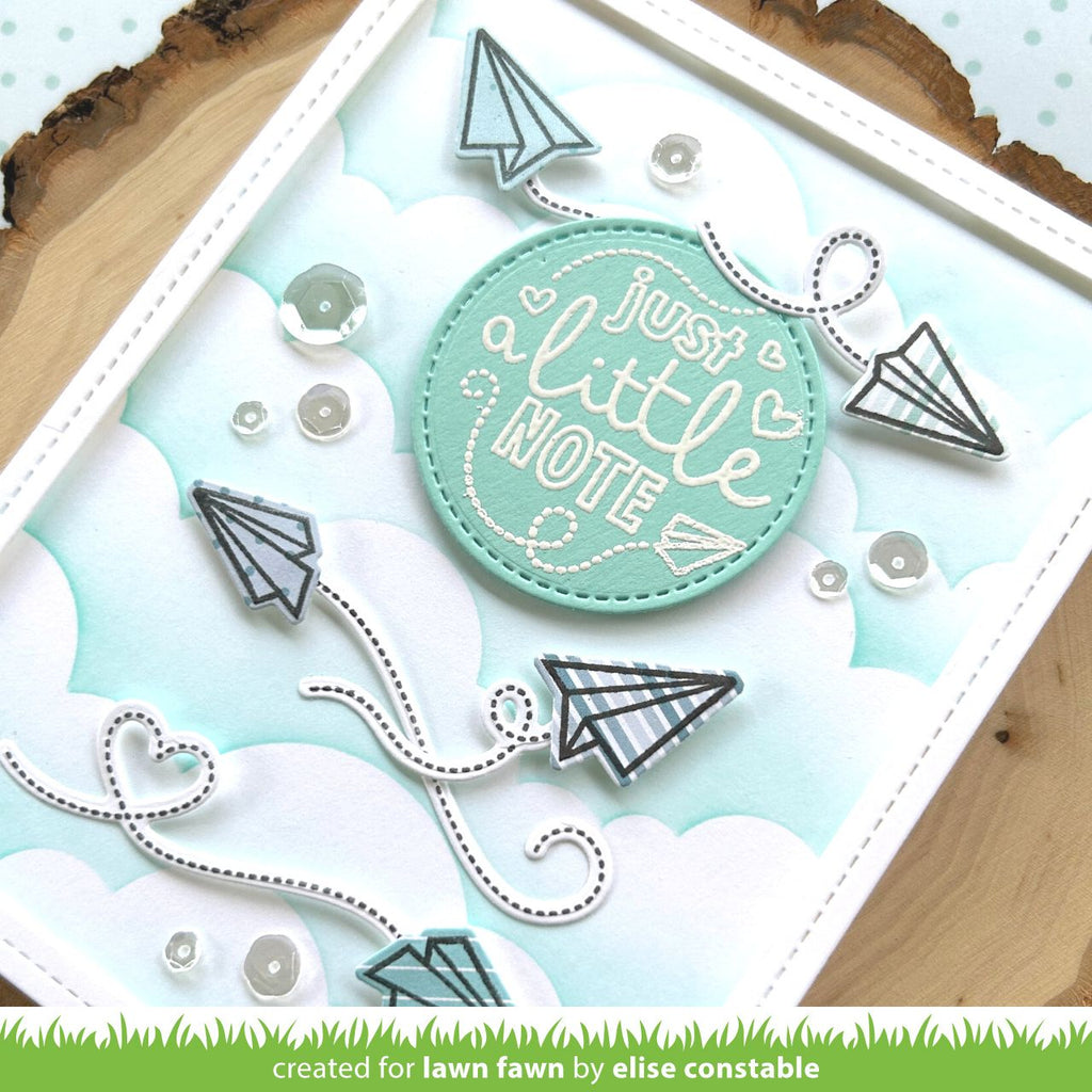 Coordinating set ideas: Add these fun sentiment trails to the airplanes in Plane and Simple. Cloud Background Stencils help create a fluffy cloud scene for your gliding paper airplanes. These trails can also be used with the buzzing bees from Hive Five!