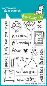 You will have perfect chemistry with this geek chic set of 23 clear stamps! This set contains cute nerd birds, a smiling calculator, book, beakers, and lots of sentiments to match.