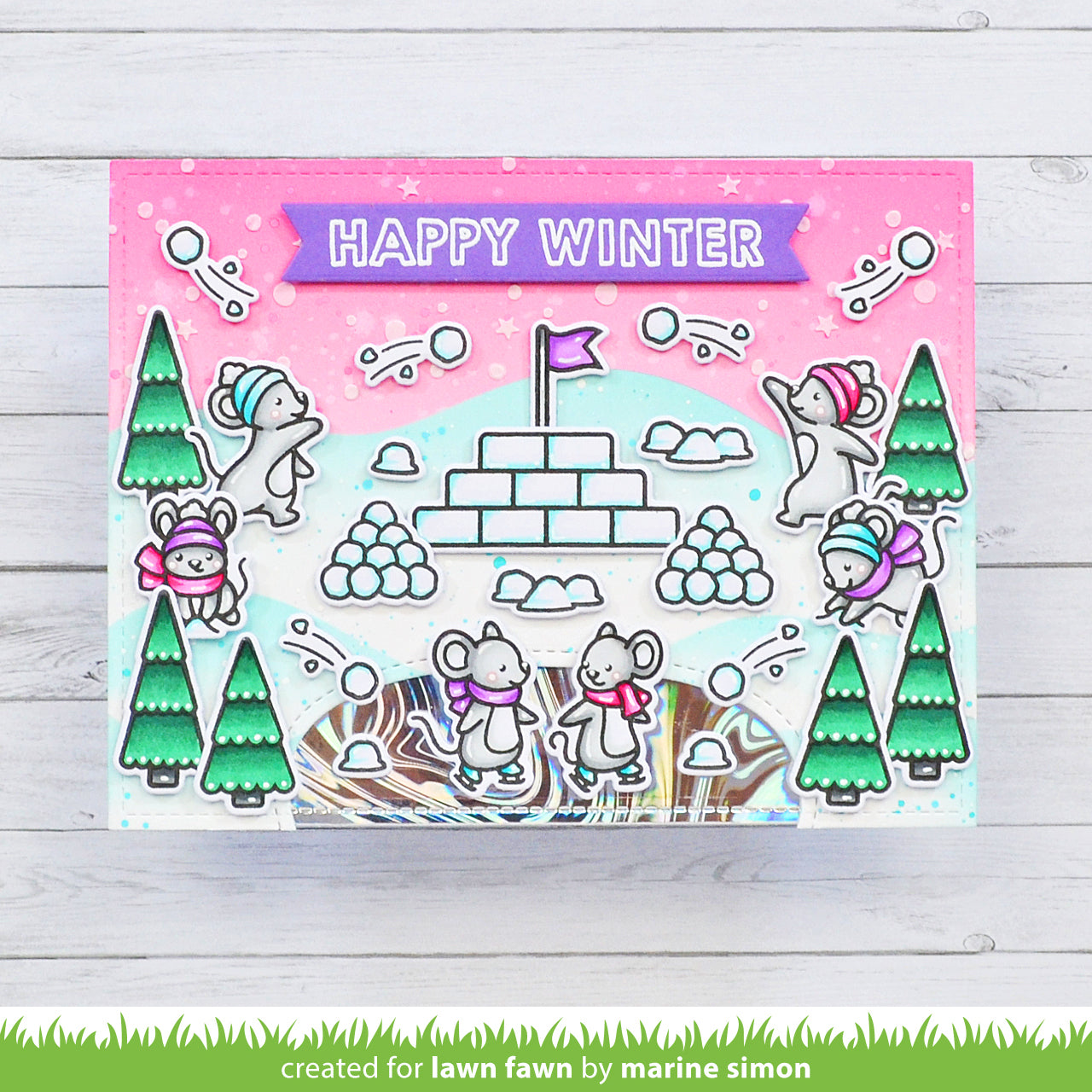 Take cover! The mice bundled up and are having an epic snowball fight but it’s all in good fun! And when they’ve run out of snowballs they can work on the cutest “snowmouse” together!