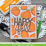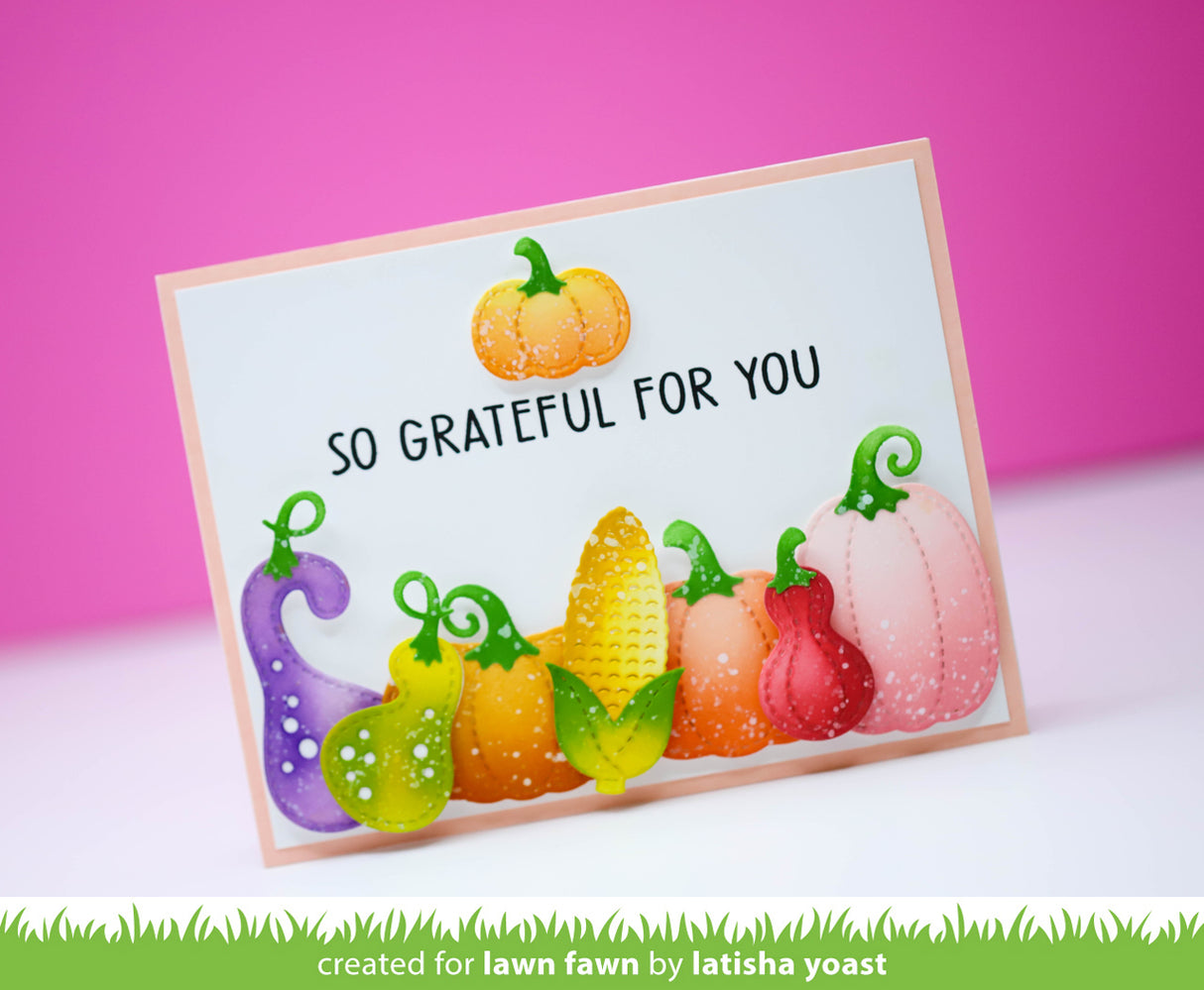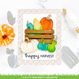 Coordinating set ideas: Use the leaves and vines from Pumpkin House to add lots of extra details to your Stitched Pumpkins. Fill a Harvest Crate full of these cute pumpkins for a quick fall greeting and finish it with a shiny sentiment from the Big Scripty Words Hot Foil Plates and Big Scripty Words Lawn Cuts sets. Want to create a Jack-o-Lantern? Use the many different face images from Pick of the Patch to carve your own pumpkin for Halloween greetings.