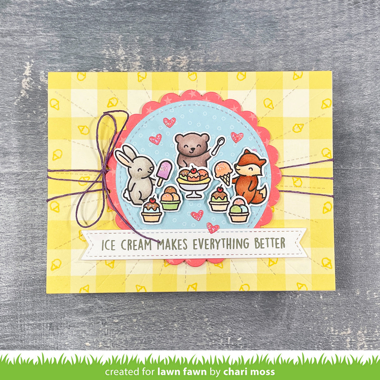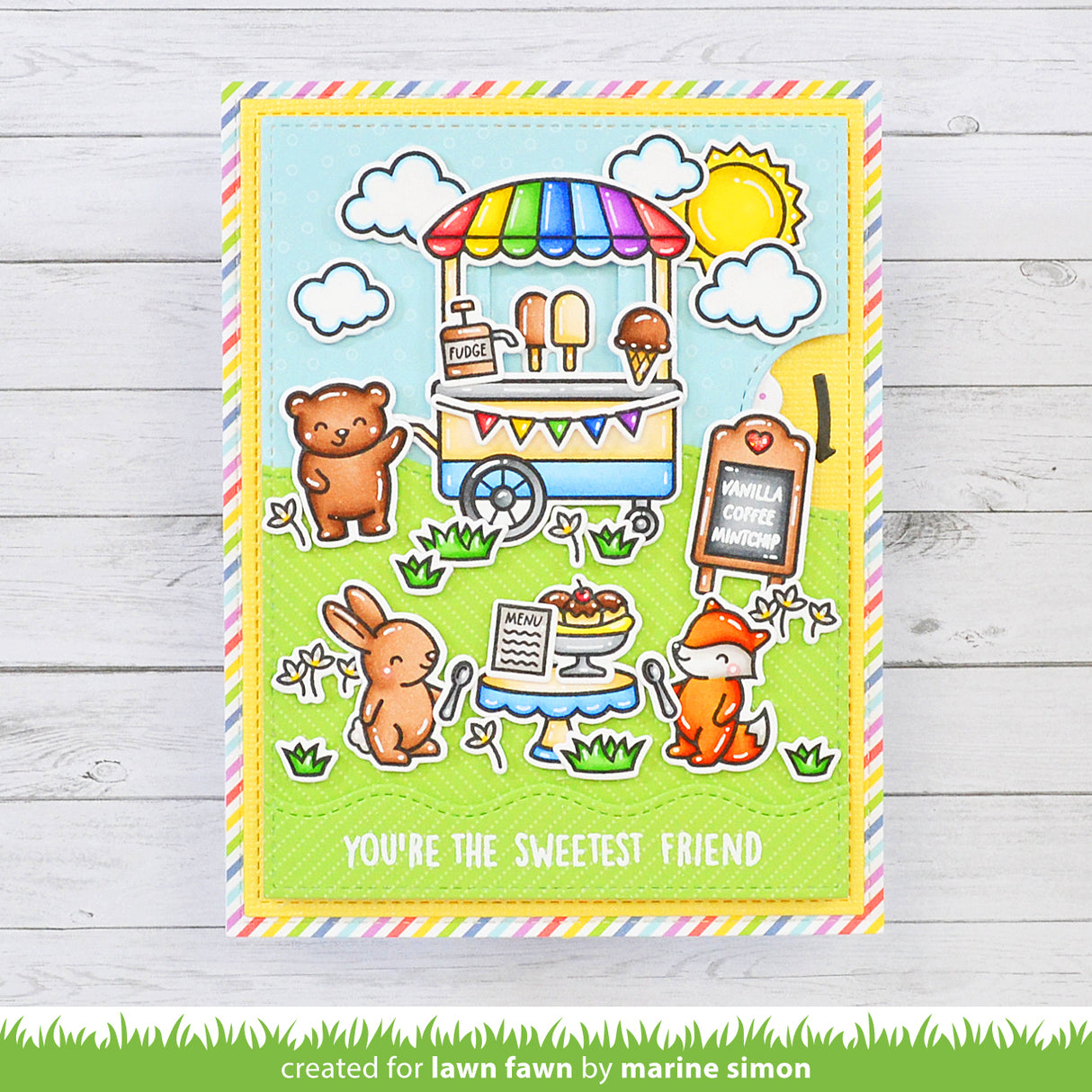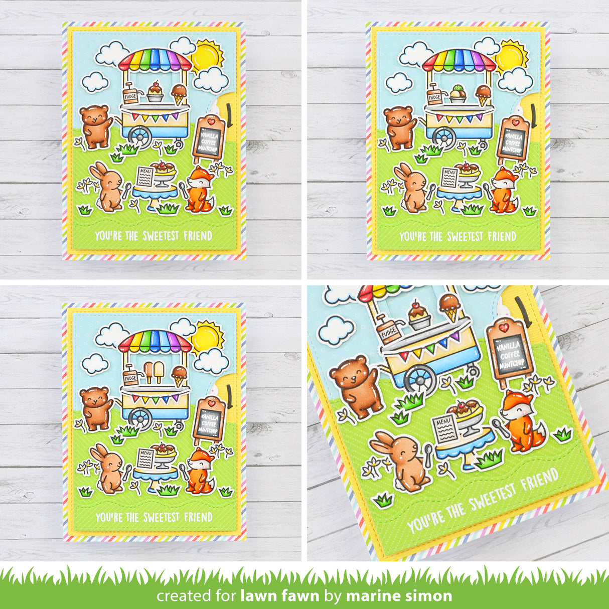Coordinating set ideas: Set up a cute treat shop using Ta-da! Diorama! and Ta-Da! Diorama! Shop Add-On. Add some giant whimsical treats for your sweet critters with Here’s the Scoop. The Sweet Friends stamp set has more punny sentiments that would pair sweetly with this set. Looking for the perfect speech bubble for the included tiny sentiments? Check out All the Speech Bubbles and All the Speech Bubbles Lawn Cuts!