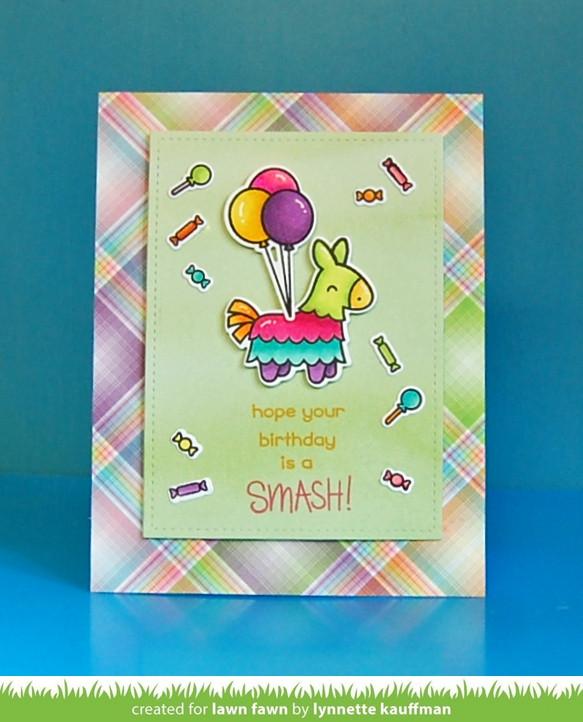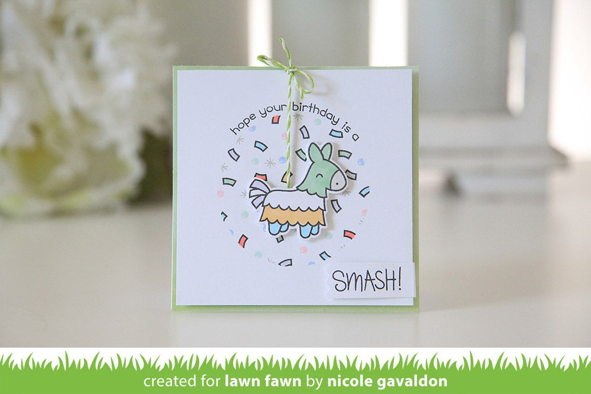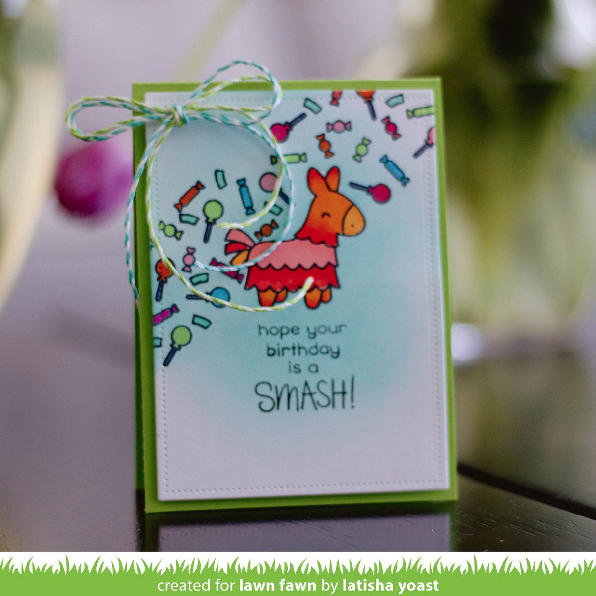 Hope your birthday is a smash! This cute mini set of clear stamps was created to celebrate Lawn Fawn’s seventh birthday. Stamp the piñata and the sentiment for an easy birthday card. Or make a scene with the piñata hanging from a tree, surrounded by confetti and candy spilling out!