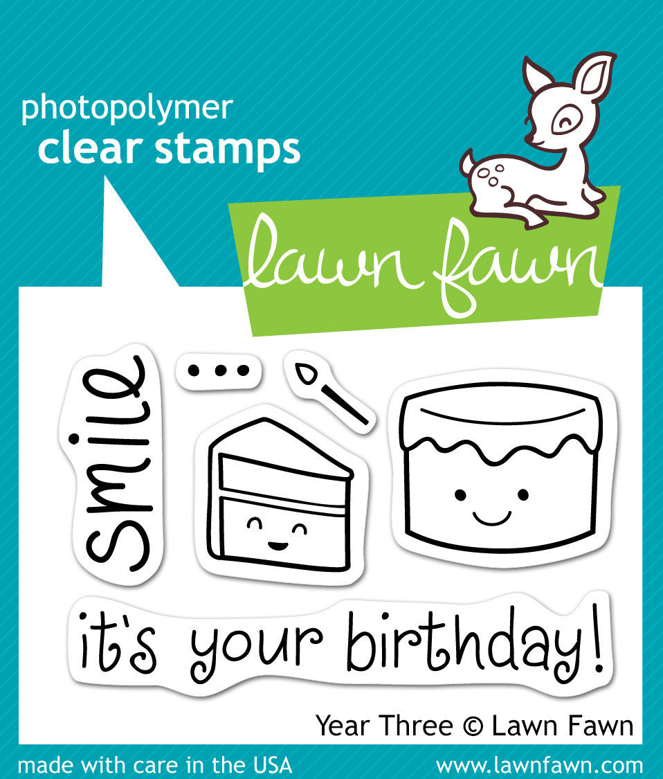 Smile, it's your birthday! This collection of six clear stamps was created to celebrate Lawn Fawn's third birthday.